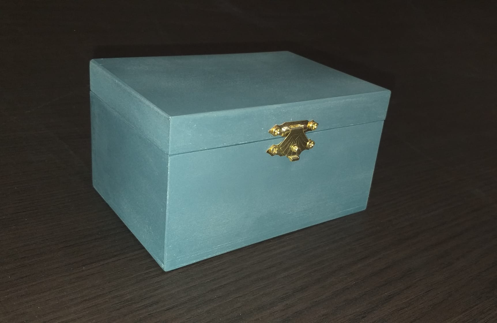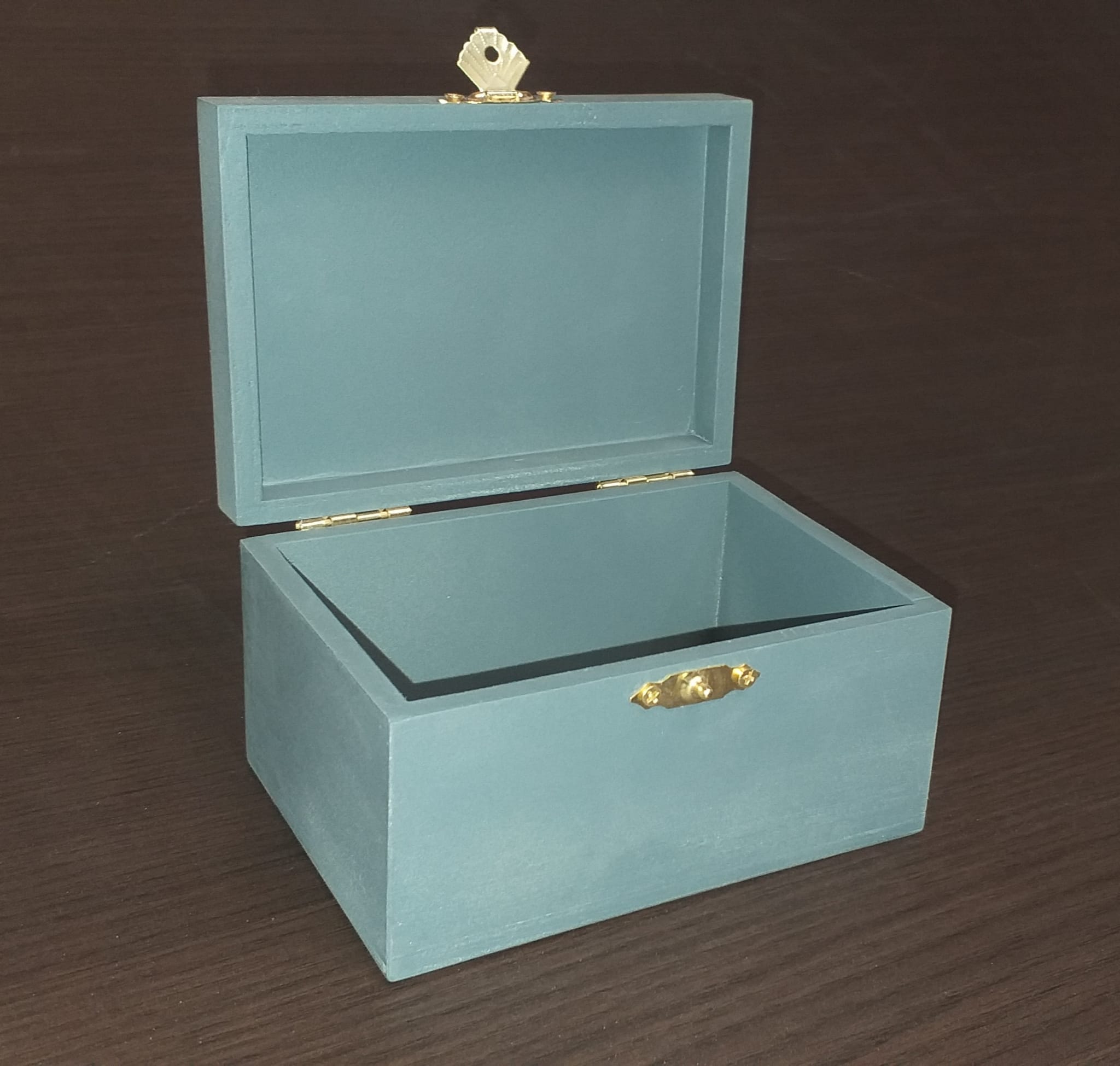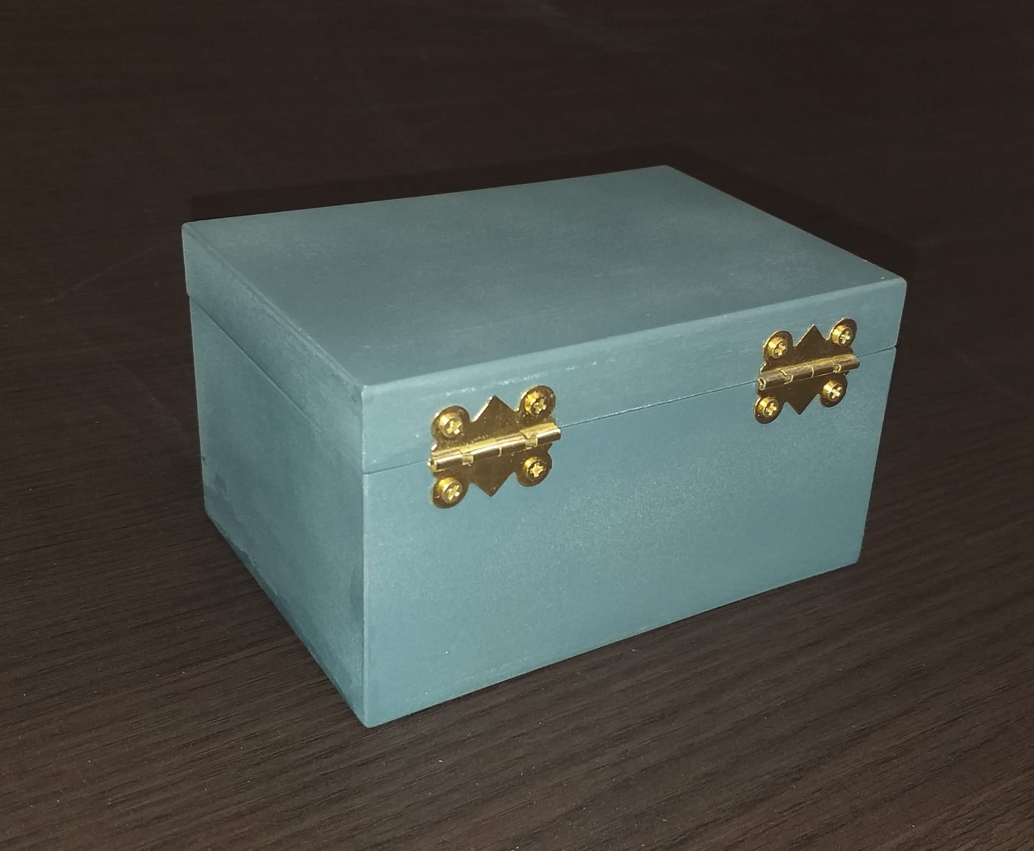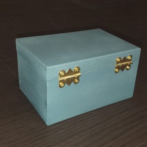 Cajita de madera de chopo abatible con cierre y bisagras en dorado y con esmalte en azul grisáceo. Ideal para regalar.
