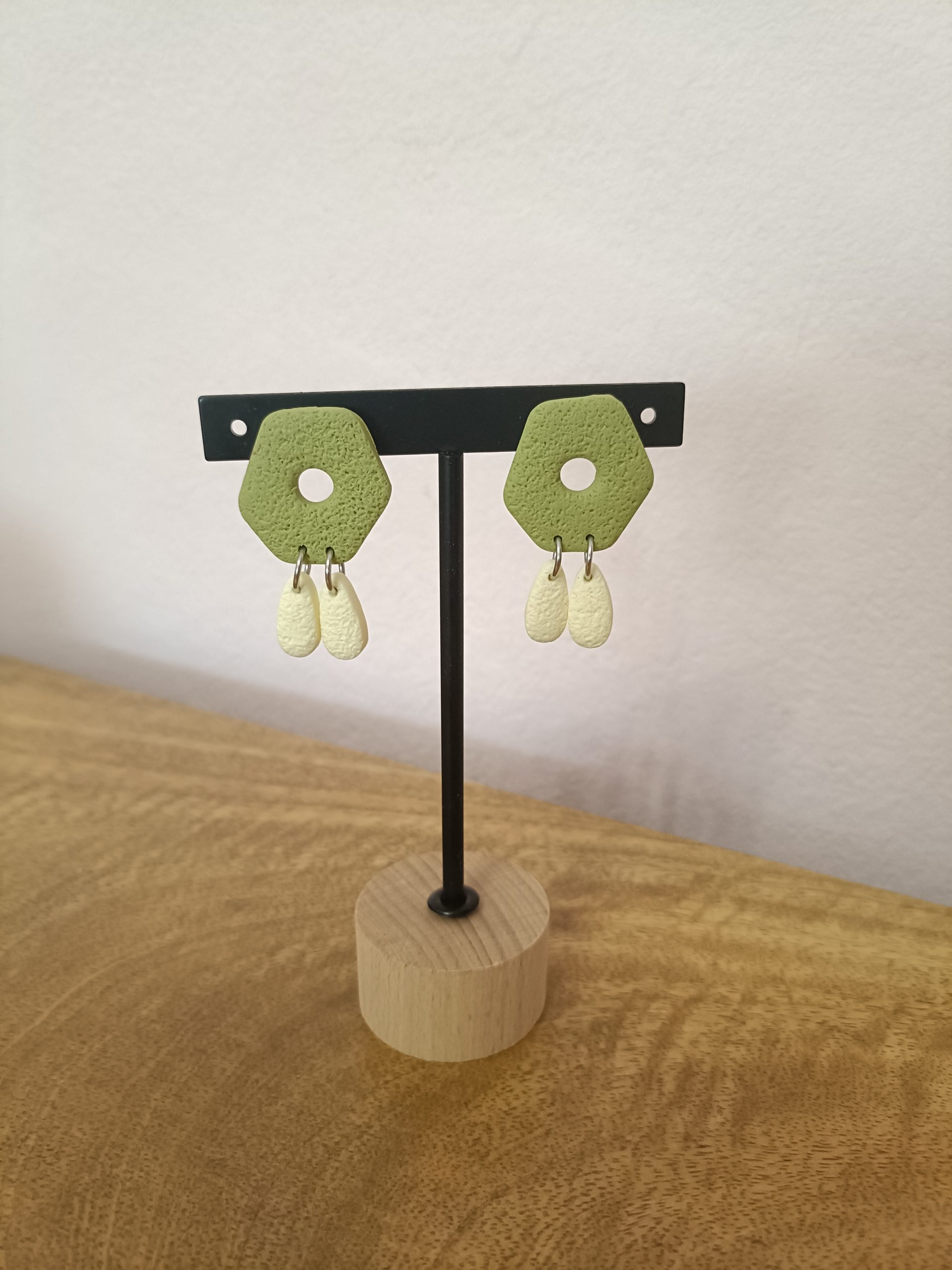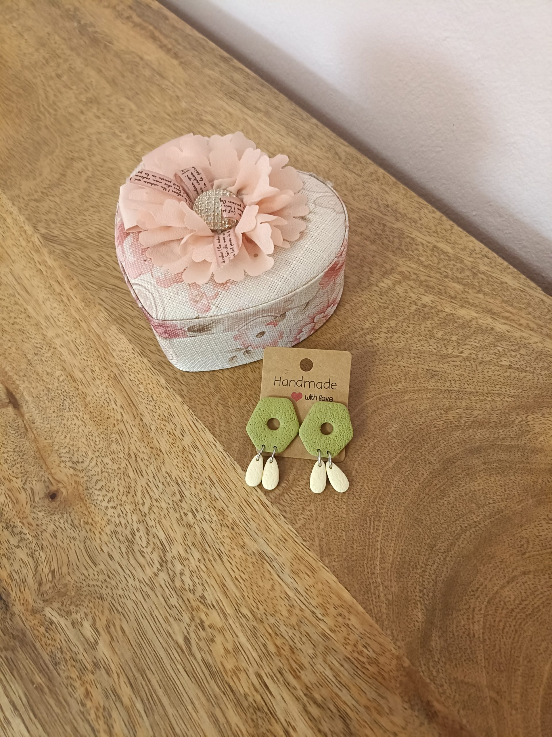Pendientes hechos a mano con diseño hexagonal estilo «boho» en tono verde oliva. Ligeros, modernos y perfectos para dar un toque único y elegante a cualquier outfit.